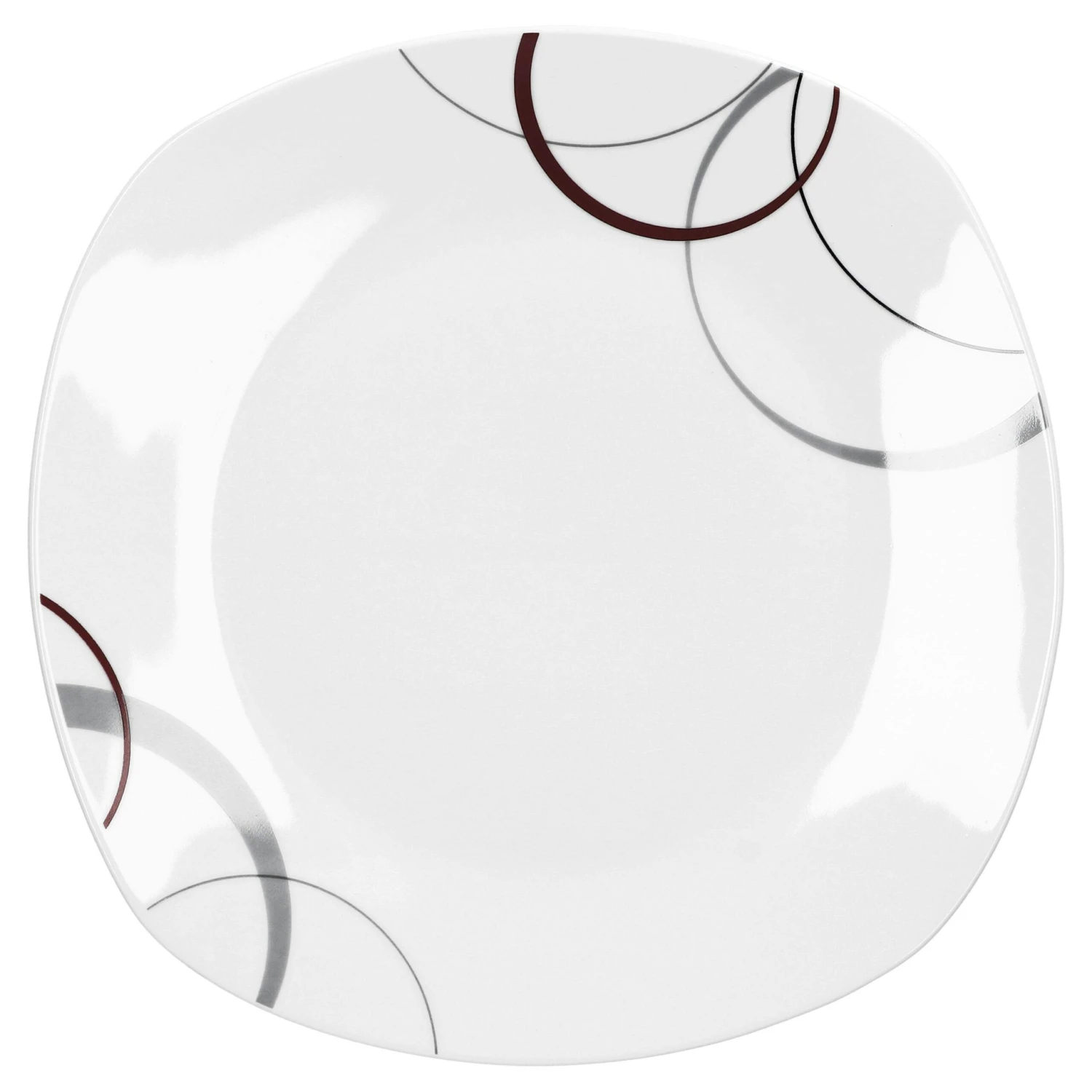 große und breite Kreise in den Farben grau und dunkelrot. Die Form der Teller ist leicht eckig –