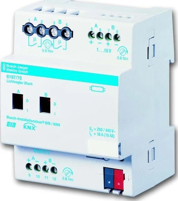 Busch-Jaeger LED-Dimmer 6155/40 Hersteller: Busch-Jaeger Bezeichnung: LED-Dimmer KNX EB-Dimmer Typ: 6155/40 Bussystem KNX: ja Montageart: Einbauinstallation Mit Busankopplung: ja Mit LED-Anzeige: ja Max. Schaltleistung: 100 W Anzahl der Ausgänge: 4 Max. Steuerstrom: 1000 mA Schutzart (IP): IP20Busch-Jaeger LED-Dimmer 6155/40: weitere Details1- 4 Kanal LED-Dimmer für LED-Module mit Konstantspannung. Ansteuerung von RGB oder RGBW-LEDs möglich. Zusammenfassung von 2 x 2 Kanälen zur Ansteuerung von Warm-/Kaltweiß-LED-Stripes. Zusammenfassung von 3 Kanälen zur Ansteuerung eines RGB-LED-Stripes. Zusammenfassung von 4 Kanälen zur Ansteuerung eines RGBW-LED-Stripes. Mit integriertem Netzteil. Bündelung der Kanäle möglich. Integriertes Lastmanagement zur automatischen Anpassung der maximalen Stromstärke pro Kanal in Abhängigkeit der genutzten Kanäle. Master/Slave-Funktion. EAN: 4011395202098 Geliefert wird: Busch-Jaeger LED-Dimmer KNX EB-Dimmer 6155/40, Verpackungseinheit: 1 Stück, EAN: 4011395202098