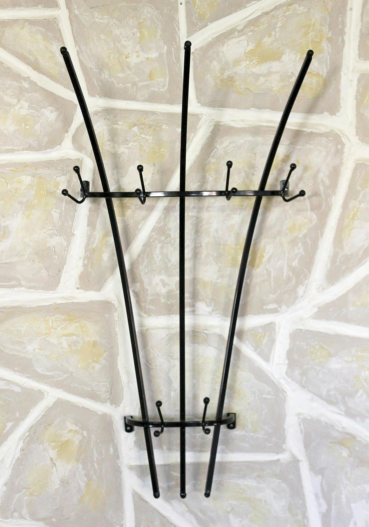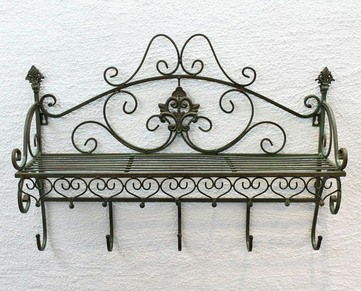 Wandgarderobe Malega – aus Metall geschmiedet. Komplett mit Rostschutzfarbe grundiert und mit hochwertigen Lackfarben lackiert. Farbe – Patina Antik. Maße: Höhe ca. 44 cm, Breite ca. 60 cm, Tiefe ca. 17 cm.