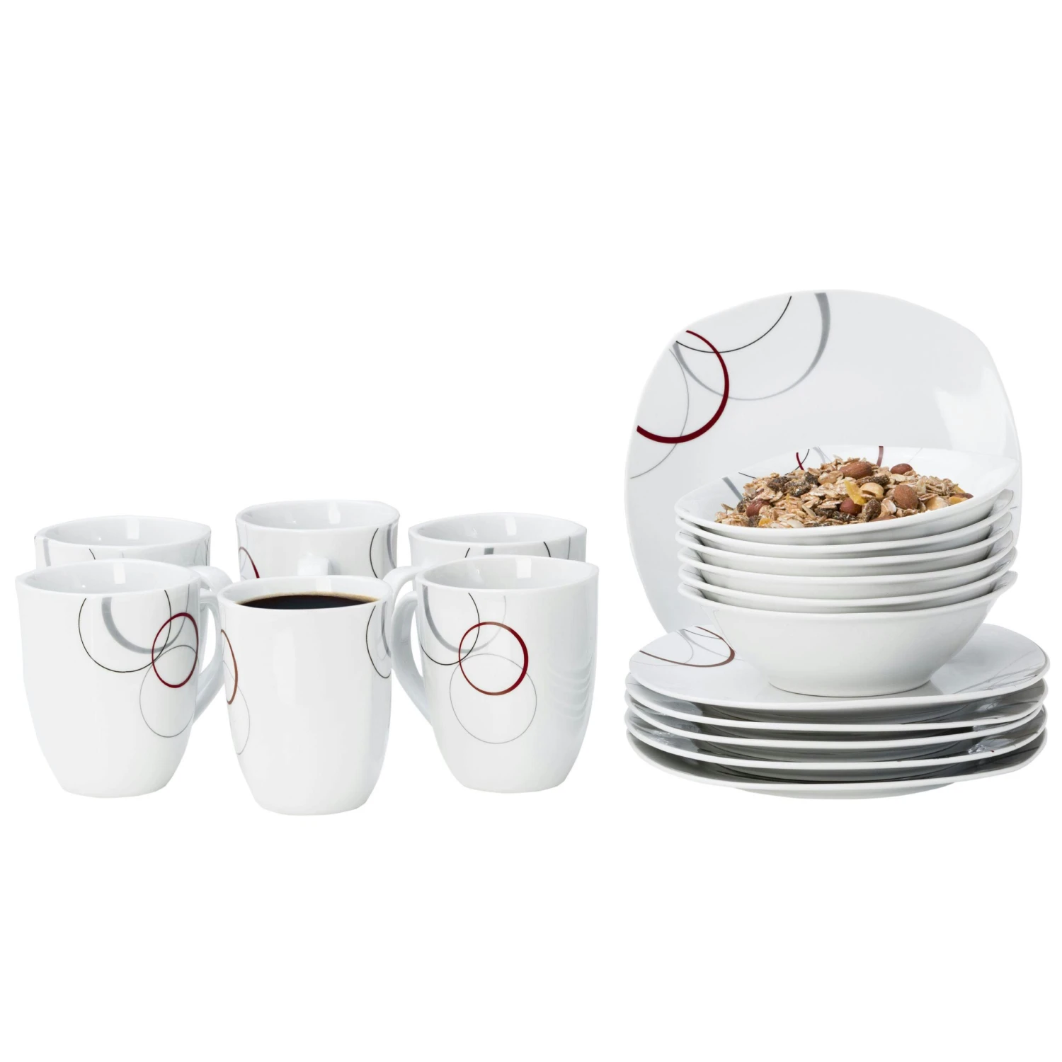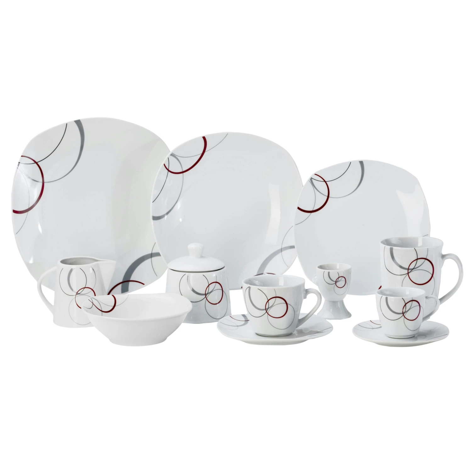 Unterschiedlich große und breite Kreise in den Farben grau und dunkelrot. Der Rest des Service ist