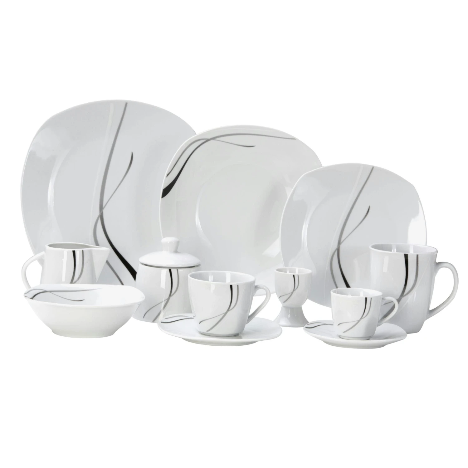 Umfangreiches Kombiservice aus dem Hause Van Well. Die vielen Geschirrteile bilden die perfekte Grundausstattung für verschiedene Menüs oder das Buffet mit bis zu 6 Personen. Schwungvolle Linien im Schwarz-Grau-Verlauf zieren die Silver Night-Kollektion. Der silberne Streifen setzt stilvolle Highlights. Profitieren auch Sie von Markenporzellan in hoher Qualität.