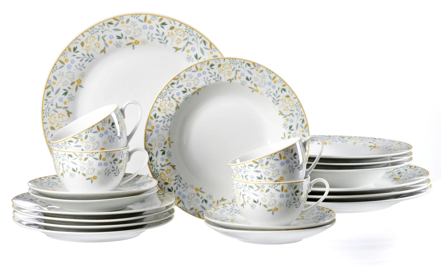 Kombiservice, Porzellan, 20-teilig, für 4 Personen, spülmaschinengeeignet, 4 Obertassen 220 ml, 4 Untertassen 16 cm, 4 Frühstücksteller 20,5 cm, 4 Speiseteller 26,5 cm, 4 Suppenteller 21,5 cm. Wer Blumen mag, wird cora lieben! Der detailreich gestaltete Floral-Dekor ist dank der soften Farben erfrischend dezent und zeitlos aktuell. Das stylishe Kombiservice sorgt vom Frühstück bis zum Abendbrot für helle Freude.